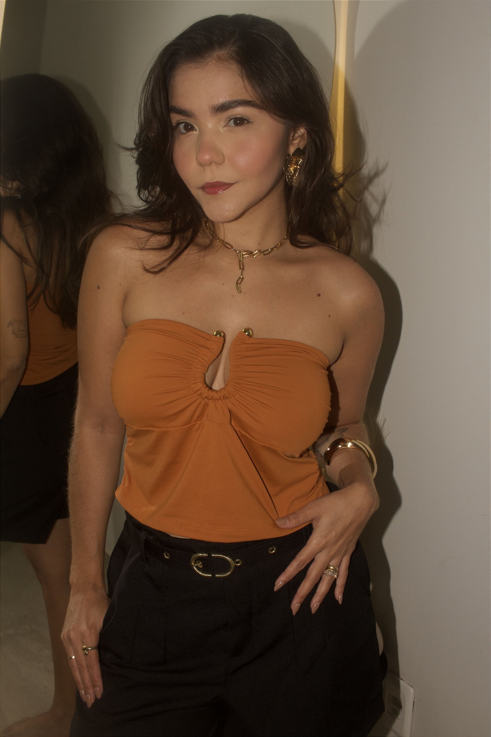 Blusa tomara-que-caia (sem alças), tecido poliamida que fica ajustado ao corpo, com drapeado frontal e recorte central em formato de gota preso por argolas/metais dourados, criando um detalhe estruturado no busto. Estilo mais elegante e moderno.