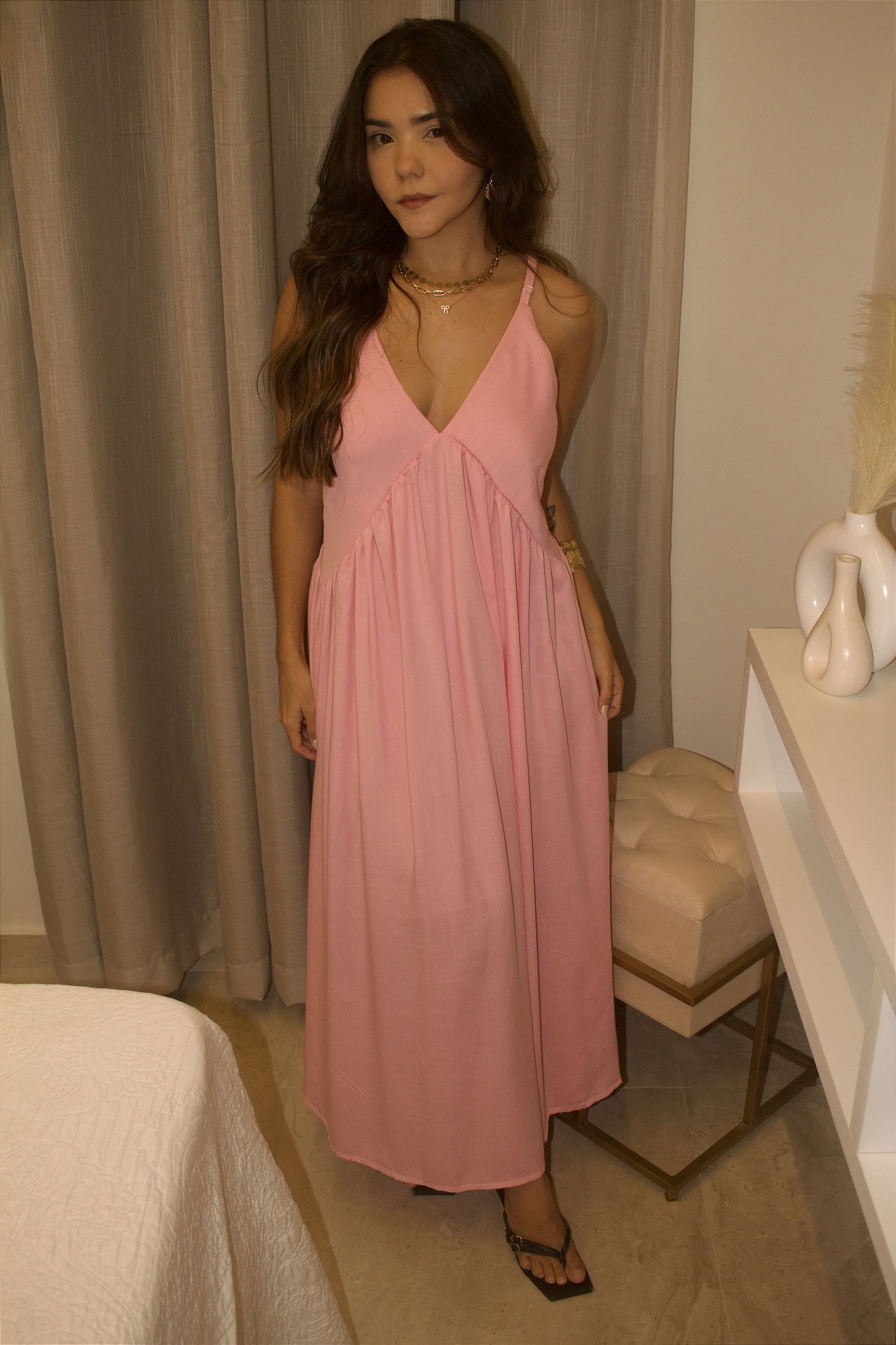 • Modelagem: evasê (abre levemente a partir da linha abaixo do busto, criando movimento e leveza).